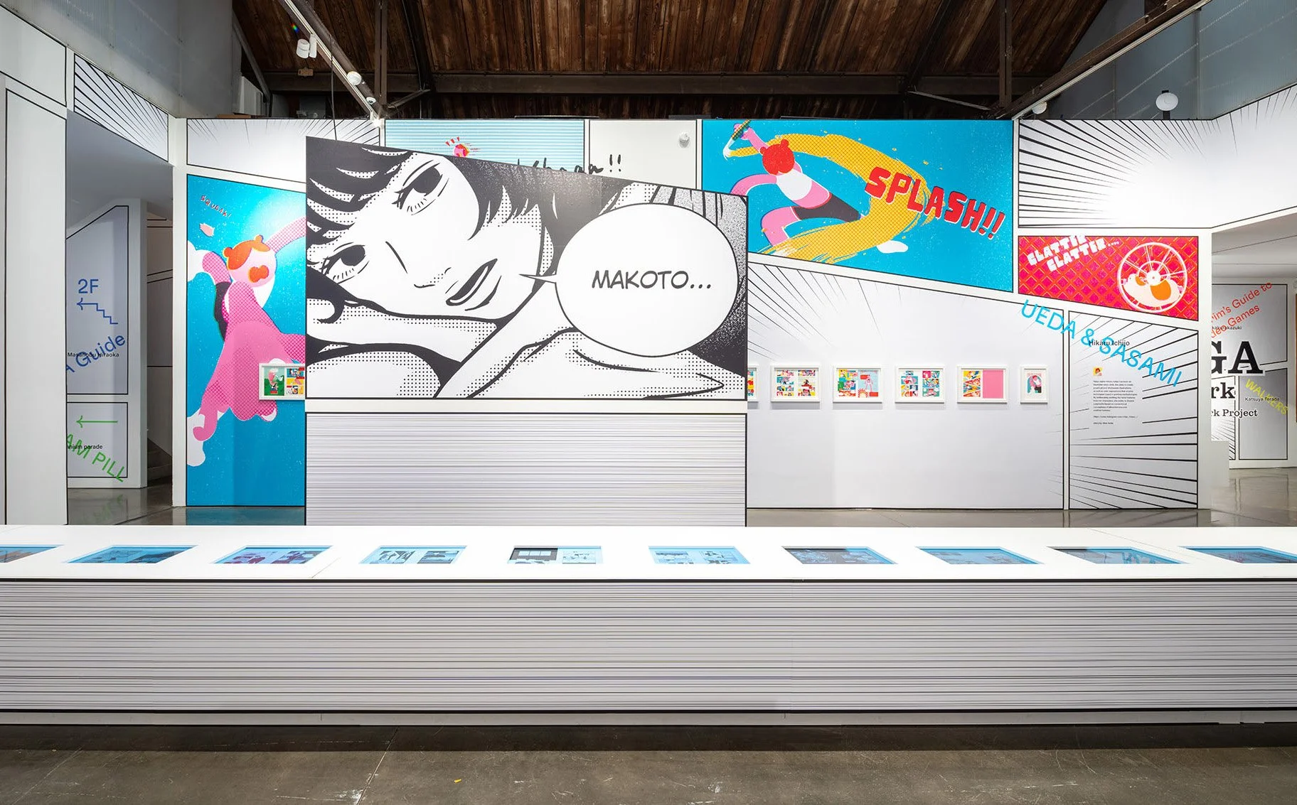 ますだみくの作品は、一連のストーリーとその時間を横並びで辿る、巻物の見せ方とした。寺田克也のエリアでは、大きな本の間を散策する中で、絵と瞬間的に対面していく。たかくらかずきの作品は、一人や皆でページを捲りながら楽しむ、漫画的コミュニケーションの場となり、millenium paradeのエリアでは、主人公の感覚を床面から触覚で感じることができるテクノロジー(Haptics)が臨場感を演出する。2Fに展示された平岡政展のエリアでは、コマの一部がアニメ化(animate)されることで、シンプルで静かなストーリーが、文字通り生き生きとした奥行きと共に見えてくる。