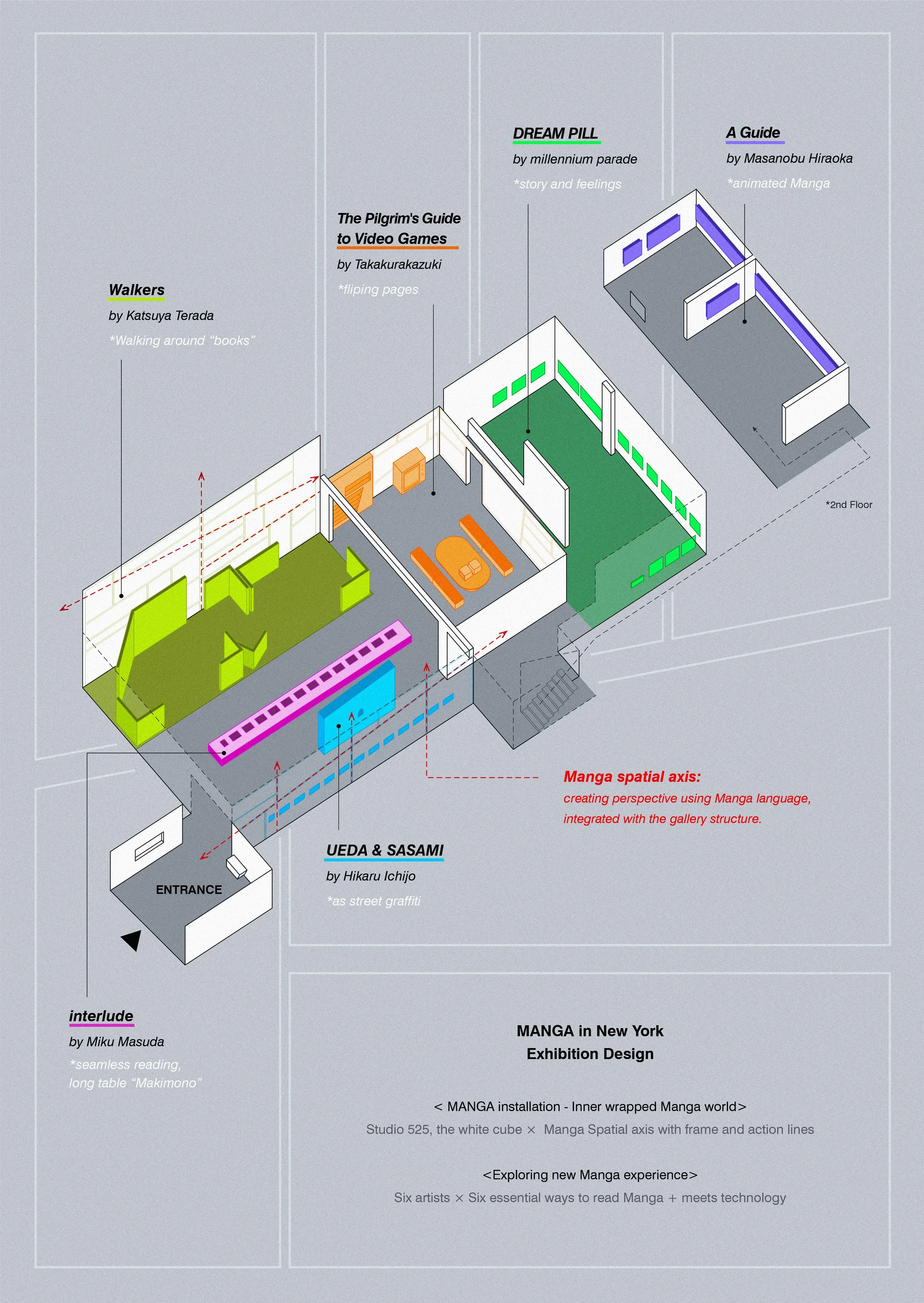 The exhibition, named "MANGA in New York," was a project to create a unique installation inspired by MANGA, one of the representative cultures of Japan. It also was a challenge to provide new types of reading experiences combined with multiple techniques and technologies.