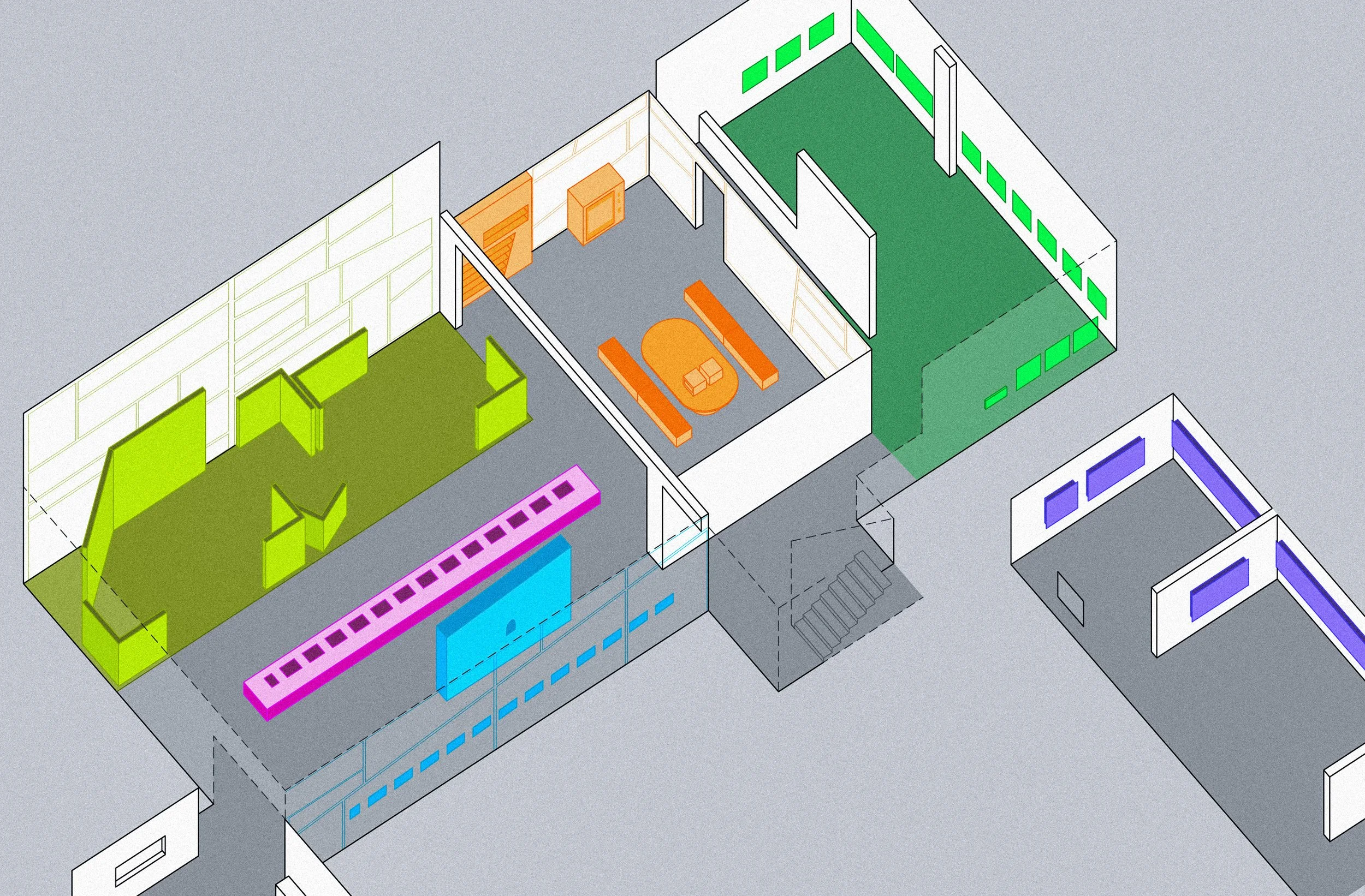 The venue, Studio 525, is a white cube like a blank paper. Over the existing white surface, we pasted black lines along the spatial outlines, which metaphorically acted as the Manga frame. This production process of overlaying lines, illustrations, and texts added textures to the two-dimensional design.